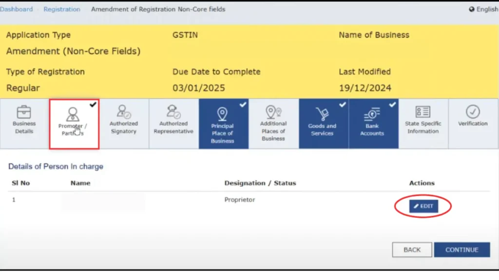 Step 2: Navigate to ‘Amendment of Registration Non-core Fields’